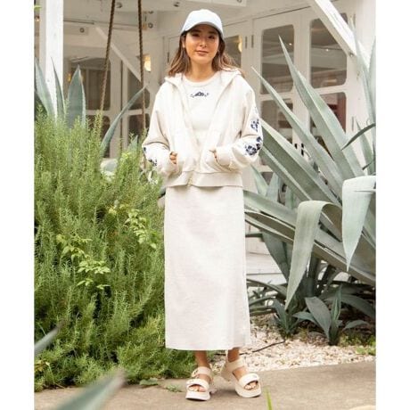 [型番:4CA-6147-2026]短丈のジップパーカーとリブワンピースのセットアップ。パーカーは柔らかな裏毛素材、ワンピースは伸縮性のあるリブ素材で動きやすく、スタイルアップ効果も◎。ワンピースのフロントにはワンポイント刺しゅう入り。コーディネートしやすいWジップ仕様です。パーカーとワンピースのセット商品