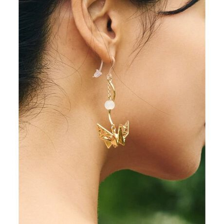 [型番:7CNZ6101-2026]立体的な折り鶴モチーフが印象的なピアス。羽には七宝柄風の透かし模様が施され、繊細なきらめきが耳もとを上品に彩ります。優美で存在感のあるアクセサリーです。