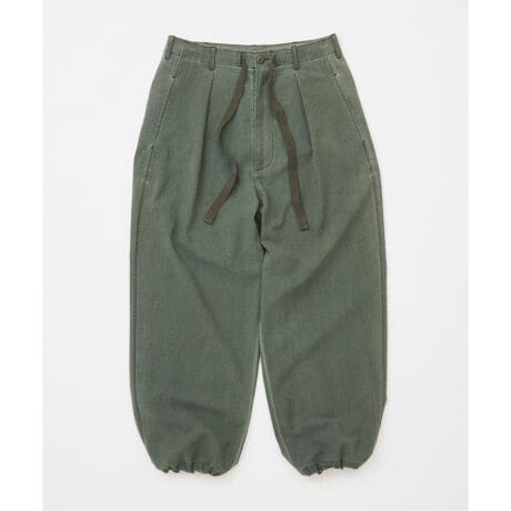 麻調素材「EVALET(エバレット)」にピグメント加工を施し、さらに洗いをかけることで、独特のシボ感とフェード感を表現した新素材を使用したオーバーパンツ。
