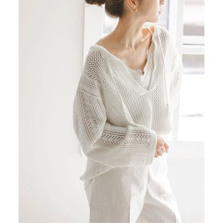 身頃と脇部分・袖で編み方を変え柄に変化を付けディテールにこだわったことで、1枚で着用してもシンプルになりすぎずオシャレに決まるのが嬉しい。編み地の透け感で柄の表情を楽しめ、高級感も増しています。