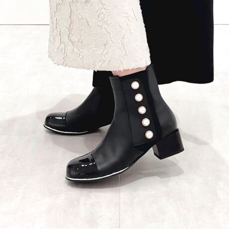クラシックな品格と日常の履きやすさを兼ね備えた主役級ブーツ。サイドに並んだパール×ゴールドのディテールが、足元に華やぎをプラスします。つま先の切り替え部分はつややかなエナメルレザーで、異素材MIXのこだわりデザイン。安定感のある4cmヒールと伸縮性のあるサイドゴアで、歩きやすさと着脱のしやすさも両立しました。スカートにもパンツにも相性がよく、オン・オフ問わず活躍する一足です。