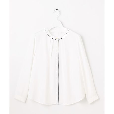 ・バイカラーラインがポイントのきれいめブラウス・ジャケットやカーディガンを羽織ってもポイントになるデザイン・前のボタンを外して被るだけで着脱可能で楽ちん・裾はシャツテールで、ボトムスIN・OUTどちらでも綺麗なシルエットを楽しめます