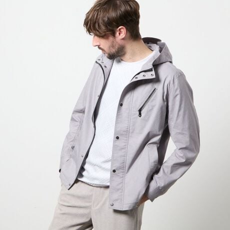 フード一体型のマウンテンパーカーデザイン。胸のファスナーポケットをアクセントにフロント、袖口にはオリジナルのロゴ入りドット釦を使用して高級感をプラスしました。一重の仕様で軽く羽織れるデザインに仕上げています。