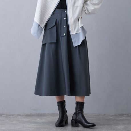 足首上あたりまでのスカート丈で濃色でも足元が重たくならないのもうれしいポイント。