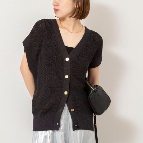 ・シンプルなデザインですが、ザックリとした片畦編みやメタル釦で、さらっと着るだけでもアクセントになるベスト