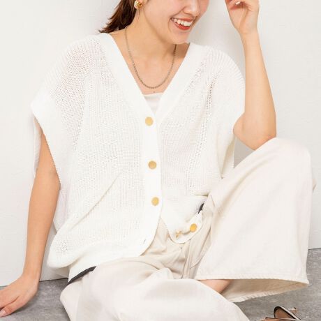 ・シンプルなデザインですが、ザックリとした片畦編みやメタル釦で、さらっと着るだけでもアクセントになるベスト