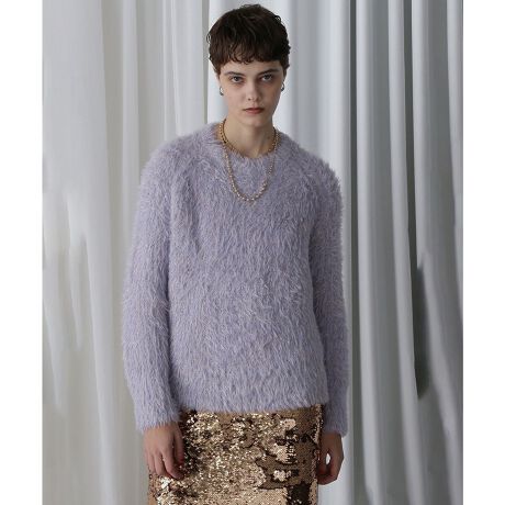 ラメ糸とフェザー糸を引き揃えて編んだふわっとした毛足の質感が特徴のニットプルオーバー。
