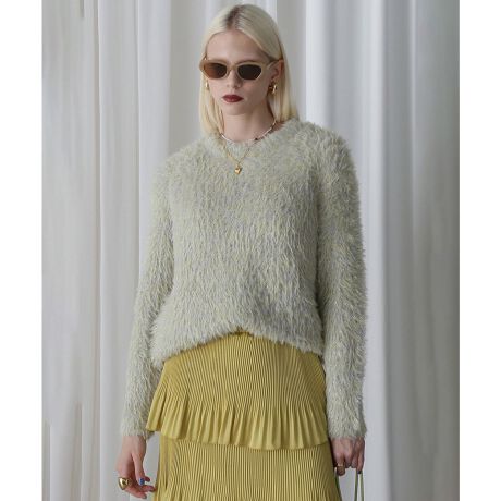 ラメ糸とフェザー糸を引き揃えて編んだふわっとした毛足の質感が特徴のニットプルオーバー。