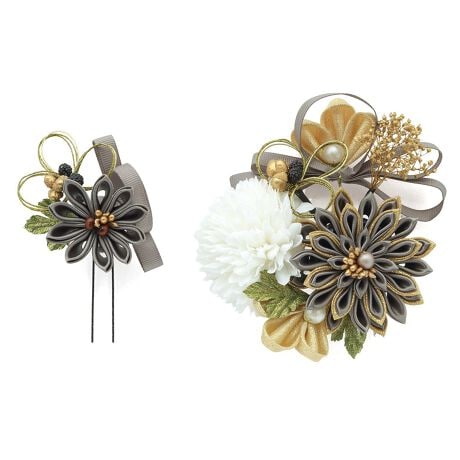大きな髪飾りの留め具はコーム(櫛)式、小さな髪飾りはUピン式ですので、着物に合わせ自由な組み合わせでご使用いただけます。