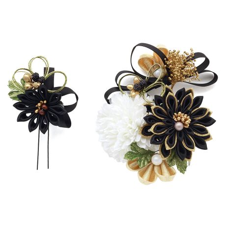 大きな髪飾りの留め具はコーム(櫛)式、小さな髪飾りはUピン式ですので、着物に合わせ自由な組み合わせでご使用いただけます。