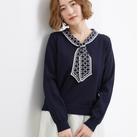 ディテールで差がつく大人のスカーフ柄ボウタイニット。