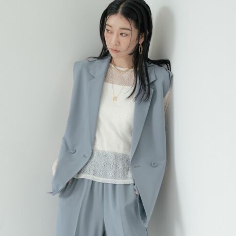テーラーカラーでマニッシュに引き寄せたジレは、軽快なデザインが魅力。
