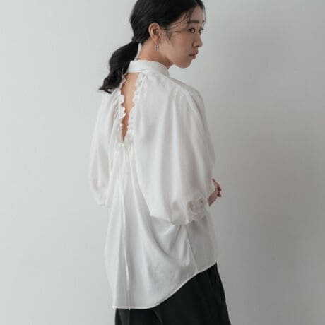 ふんわりとした袖でやわらかさを引き立てつつ、背中のカットアウトとドローストリングでモードに引き寄せたデザインです。