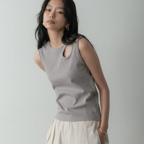 肩部分のカットアウトがスタイリッシュな印象を与え、シンプルながらも洗練された雰囲気を演出します。