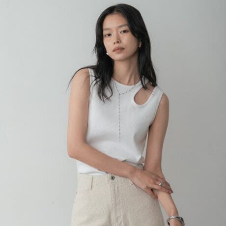 肩部分のカットアウトがスタイリッシュな印象を与え、シンプルながらも洗練された雰囲気を演出します。