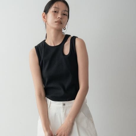 個性的なアシンメトリーのデザインが目を惹くタンクトップ。