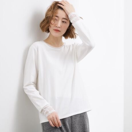ベーシックなシルエットに、袖口と襟ぐりへさりげなくシアー素材をドッキングしたデザインロンT。