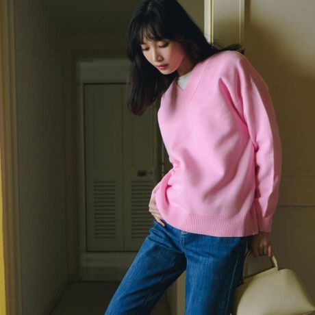 ラフさときれいめを両立する、大人のスウェットライクVネックニット