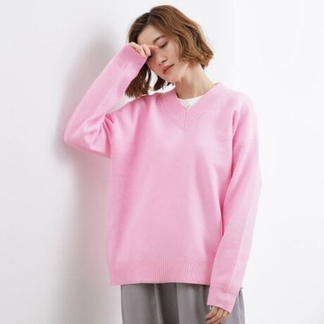 スウェットのような雰囲気をニットで表現した、Vネックデザインのトップスです。