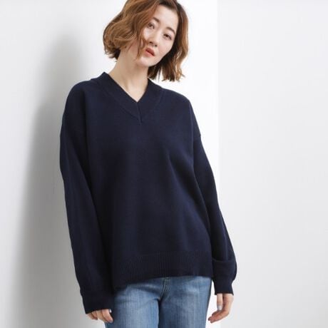 スウェットのような雰囲気をニットで表現した、Vネックデザインのトップスです。
