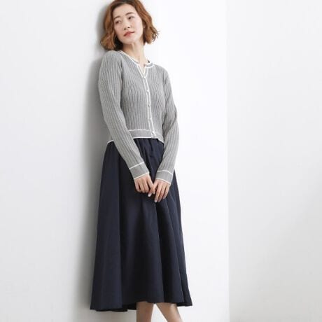 キーネックラインで抜け感のある衿ぐりが印象的な、ニットカーディガン×スカートのドッキングワンピース。