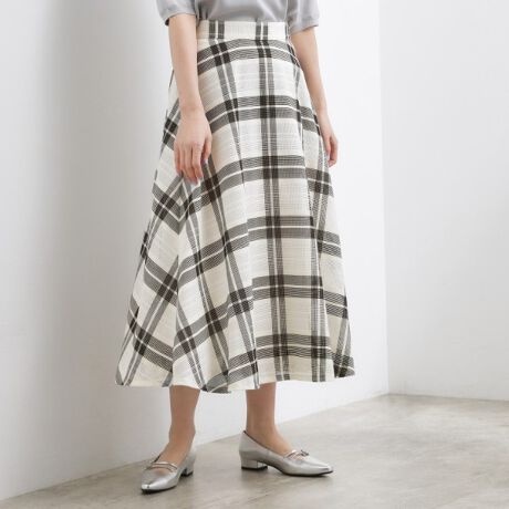 上品なミモレ丈で、動くたびにチェック柄の表情が引き立ちます。