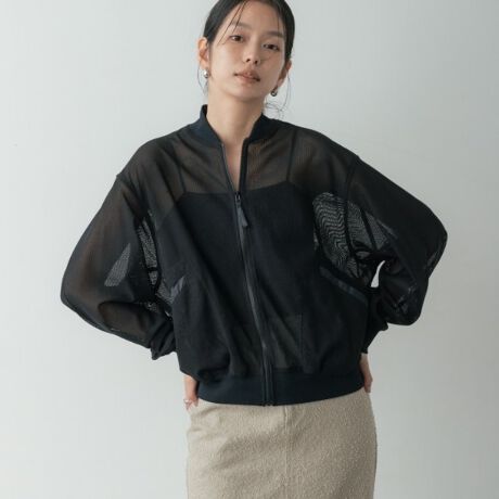 透け感のあるメッシュ素材が軽やかな印象を与えるボンバージャケットデザインのブルゾン。