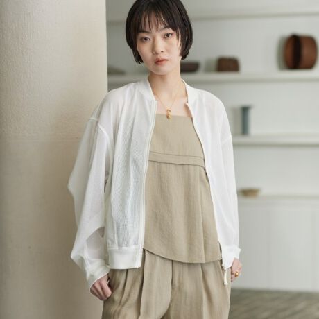 透け感のあるメッシュ素材が軽やかな印象を与えるボンバージャケットデザインのブルゾン。
