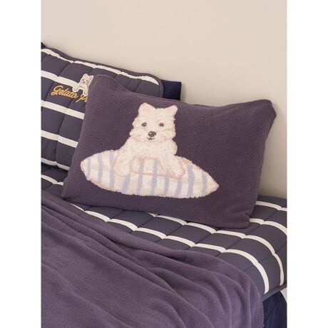 ビーグルにラブラドゥードル、ウェスティ。おうちの中で楽しく遊ぶワンちゃんたちの姿をテーマにした、UNISEXでお楽しみいただける寝具シリーズです。表情豊かなワンちゃんたちをジャガードで表現した、‘エアリーモコ’素材のピローケース。ふんわり、さらさらな肌触りは、これから春にかけての時期にちょうど良い素材感です。それぞれのワンちゃんたちが、gelato piqueらしいボーダーの枕と一緒にリラックスしているのがポイント。背面は配色のロゴデザインで、インテリアにキャッチーなアクセントを添えてくれます。色はビーグル柄のオフホワイト、ラブラドゥードル柄のブルー、ウェスティ柄のネイビーの全3色。同シリーズのルームウェアや寝具シリーズと合わせたり、春の新生活に向けてのギフトにもおすすめです。