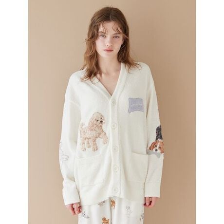ビーグルにラブラドゥードル、ウェスティ。おうちの中で楽しく遊ぶワンちゃんたちの姿をテーマにした、UNISEXでお楽しみいただけるシリーズです。さらふわの‘エアリーモコ’を使用したVネックのカーディガンに、3種類のワンちゃんたちをジャガードで表現。犬たちがじゃれているようなポーズや表情にこだわりました。ロゴ入りのボタンに、胸元の枕モチーフにはロゴ刺繍が入ったアップリケを入れました。フロントポケット付きのゆったりとしたサイズ感で、重ね着に重宝する1枚です。色はオフホワイトとネイビーの2色をご用意。同シリーズのボーダーロングパンツや、DOG柄プリントのアイテムと合わせてお楽しみください。カップルでペア・コーディネートもおすすめです。