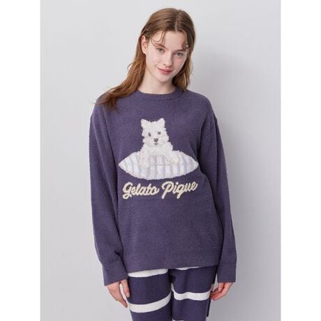 ビーグルにラブラドゥードル、ウェスティ。おうちの中で楽しく遊ぶワンちゃんたちの姿をテーマにした、UNISEXでお楽しみいただけるシリーズです。さらふわの‘エアリーモコ’を使用した3色のプルオーバーに、表情豊かなワンちゃんたちをジャガードで表現。gelato piqueらしいボーダーの枕と、ロゴを配色で描いているのがポイントです。色はビーグル柄のオフホワイト、ラブラドゥードル柄のブルー、ウェスティ柄のネイビーの全3色。同シリーズのボーダーロングパンツや、DOG柄プリントのアイテムと合わせてお楽しみください。カップルでペア・コーディネートもおすすめです。