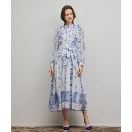 ウォールペーパー調のクラシカルなオーナメント調フラワープリントが一際目を惹くワンピース。ストライプを意識しながら作られた縦流れの柄や、スカートの裾に合わせて入れたラインなど、パターンプリントだからこその美しく贅沢な柄がポイントです。胸元には取り外し可能なボウタイをトッピングし、胸元で結んだ時に顔周りが華やかに見えるように仕上げました。ボウタイはベルトとしても着用でき、女性らしいフィット&フレアのシルエットもお楽しみいただけます。デニムブルーを意識したホワイト、ベージュ系と相性の良いイエロー、華やかなマルチカラーのブラックの3色展開。カーディガンやジャケットに合わせるのはもちろんのこと、今季はラフにカバーオールを合わせるのも新鮮でおすすめです。