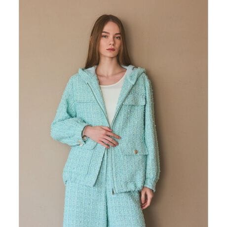 [型番:0226169018]フランスのJulesTournier(ジュールトルニエ)社の春らしいミント系のミックスヤーンが美しいツイード地のフーディコート。同シリーズでおつくりしたツイードクロップドパンツ【品番:0226111018】のご用意もございます。※こちらのモデル着用画像はサンプル品を撮影しております。実際の商品と仕様、加工、サイズが若干異なる場合がございます。予めご了承くださいませ。