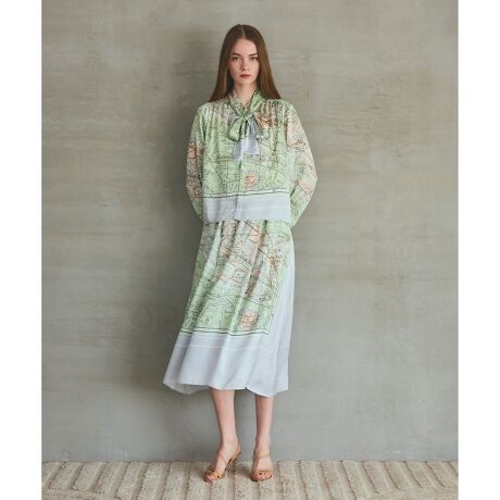 [型番:0226121021]【Japan Fabric】落ち感のきれいなツイル地に昔のパリの地図柄をパターンプリントしたイレギュラーヘムスカート。同シリーズでおつくりしたパリスカーフプリントブラウス【品番:0226141021】のご用意もございます。※こちらのモデル着用画像はサンプル品を撮影しております。実際の商品と仕様、加工、サイズが若干異なる場合がございます。予めご了承くださいませ。