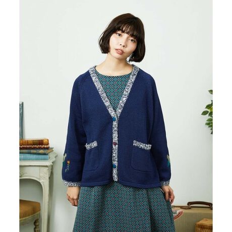 細部にまでこだわったカーディガン。テーマの「自由に飛び回る」よりインスピレーションを受けています。ラグランスリーブとゆったりとした身幅で叶うリラクシーなシルエット。首元はVネック仕様でお顔回りのすっきり見えを実現します。前立てと袖口・ポケット口には鳥の巣のようなふさふさとした糸を組み合わせた異素材感もポイントに。袖には鳥とお花の刺繍を施し、ホコモモラならではのデザインに仕上げました。前の配色ボタンはスナップで着脱可能。おしゃれ見えするカーディガンは今季イチオシのオススメアイテムです。