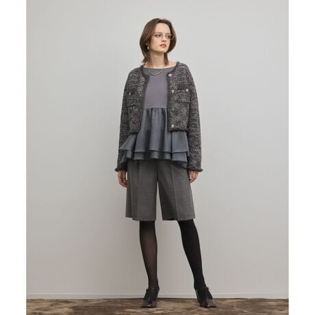 大人の女性が品よく穿ける、モードなハーフパンツ。 素材は細番手のオーストラリア産ファインメリノウールを 50%使用し、ポリエステル・ポリウレタンと混紡した、しなやかなふくらみ感が特徴の日本製生地を贅沢に使用。薄手に拘りながらも上質感があり、ブラックの無地の美しい微光沢も素材の良さを感じさせます。 マーベルトタイプのマニッシュなデザインは、セットアップで着てブーツやヒールを合わせるとモードな表情に。ニットやジャージシャツなど、リラクシーなアイテムにパンプスなどを履くだけでぐっと大人の女性らしさを演出してくれます。お揃いでお作りしたジャケットを合わせた、ワンランク上のセットアップスタイルもぜひ。