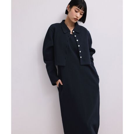 ウエスト丈の襟付きカーディガンと、ノースリーブワンピースのセットアイテム。