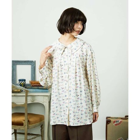 大きな襟が印象的なブラウス。テーマの「自由に飛び回る」からインスピレーションを受けています。ゆったりシルエットとドロップショルダーでリラクシーな着用感を実現。長めの丈でウエスト周りをカバーしてくれます。ギャザーの入った丸みのある袖が大人かわいさをプラス。襟ぐりに付けた共紐のリボンがデザインポイントです。水彩絵の具で描かれたような鳥プリントが春を感じる一枚。ホコモモラのこだわりが詰まった今季イチオシのアイテムです。