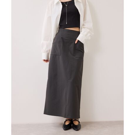 着用するとIライン見えしますが裾に向かって少し広がりを持たせており、裾スリットも入れているので足さばきも良いスカートです。腰回りにはベルト切替を入れず、トップスをインしてもアウトでもキレイに決まるデザインに。また太ももあたりにポケットを付けることで気になる箇所をカバーしスタイルアップ効果あり◎。