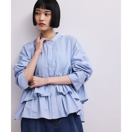大きめのフリルが目を引く、ノーカラーワイドシャツ。