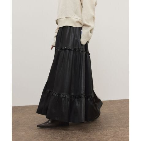 金具のついたウエスト紐もポイントに、1枚で楽に華やかに決まるスカート。