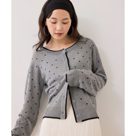 前を閉めてプルオーバー風に着用すると、ドット柄も甘くなりすぎず大人っぽい印象に仕上がります。休日はデニムやフレアスカートと合わせて、程よく力の抜けたきれいめカジュアルにも◎。インナーにシアートップスや薄手のカットソーを重ねれば、季節の変わり目のレイヤードスタイルも楽しめます♪