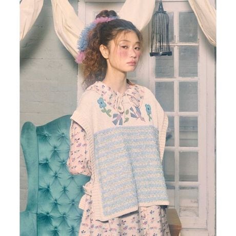 細部にまでこだわったニットベスト。テーマの「自由に飛び回る」よりインスピレーションを受けています。体型カバーも叶うゆったりとしたボックスシルエット。アームホールをたっぷりととったデザインはこなれた雰囲気を演出します。無地の糸と鳥の巣のようなふさふさとした糸を組み合わせた異素材感もポイント。胸元の切り替え部分には鳥とお花のアップリケ刺繍を施したホコモモラならではのデザインが目を惹きます。サイドのくるみボタンにも注目。おしゃれ見えするニットベストは今季イチオシのオススメアイテムです。