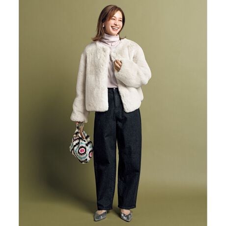 ■デザイン立体感のあるシルエットが今年らしいワイドデニム。ウエスト周りはすっきりさせつつ、サイドを緩やかにカーブさせているので、太ももやお尻周りをカバー。足首にかけてやや細くなっているのでダボダボする感じはなく、スニーカーでもヒールでも似合います。トレンドのクロップドトップスを合わせて、デニムのワイドシルエットを活かしたスタイリングがオススメです。
