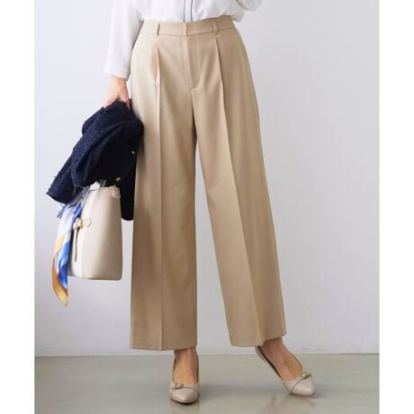・太すぎずきれいめに穿きやすいワイドストレート型パンツ・ほどよいハイウエスト感と、すっきり足長見えする美しいシルエットで、穿くだけでサマ見えが叶う一着・フロントタックがお腹周りに程よいゆとりをプラスし、センタープレスで足がまっすぐきれいに見えるデザイン・ほどよくゆとりがあり、穿きやすいのに足長&きれい見え・フロントのバーデザインがベルトなしでもポイントに・きれいな折山が長く続くクリース加工済み(前側のみ)・ウエストベルトは後ろゴム入りで伸縮性があり、楽な着心地