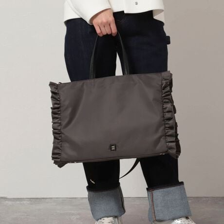 ・シンプルなナイロンバッグのサイドにフリルを配したトートバッグ。