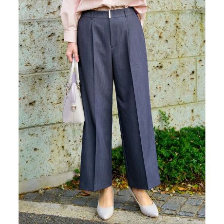 ・太すぎずきれいめに穿きやすいワイドストレート型パンツ・ほどよいハイウエスト感と、すっきり足長見えする美しいシルエットで、穿くだけでサマ見えが叶う一着・フロントタックがお腹周りに程よいゆとりをプラスし、センタープレスで足がまっすぐきれいに見えるデザイン・ほどよくゆとりがあり、穿きやすいのに足長&きれい見え・フロントのバーデザインがベルトなしでもポイントに・きれいな折山が長く続くクリース加工済み(前側のみ)・ウエストベルトは後ろゴム入りで伸縮性があり、楽な着心地