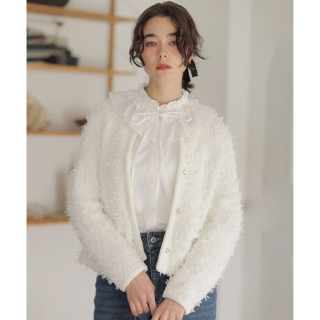 ■デザイン・ツイードを、デイリーにも取り入れやすいカーディガンに落とし込んだ1枚。・意匠性のある素材感なのでいつものスタイリングに合わせるだけでコーディネートに華やかさをプラスしてくれます。・クラシカルなアイテムだからこそ、長すぎない着丈のバランスや、オリジナルで編んだテープ、金属の釦づかいなど、細部までこだわりこなれ感と洗練された印象に仕上げました。