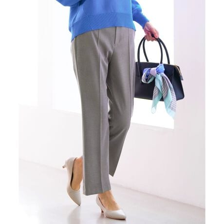 ・テーパードのきちんと感とセミフレアの女性らしいこなれ感、両方をバランスよく取り入れたNEWシルエットが初登場・ありそうでなかった、ちょうどいい形がいつものパンツコーデをさりげなく今どきにアップデート・穿くだけで自然と足が長く、ひざ位置や腰位置まで高く見えるスタイルアップ効果にこだわった一本・程よい裾幅で、ヒールはもちろんスニーカー合わせも綺麗に決まる・高め位置から入ったセンタープレスで、きちんと感と美脚見え効果もばっちり・ほどよくゆとりがあり、穿きやすいのに足長&きれい見え・フロントのバーデザインがベルトなしでもポイントに・きれいな折山が長く続くクリース加工済み(前側のみ)・ウエストベルトは後ろゴム入りで、伸縮性があり楽な穿き心地