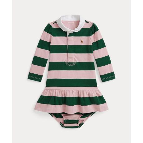 ウォッシュ加工でソフトな風合いをプラスしたジャージードレス。チノのクラブカラーとドロップウエストのシルエットで、スポーティなスタイルにキュートな遊び心を加えた一枚・ドロップウエストのシルエット・左胸にマルチカラーのシグネチャーのポニー刺繍・チノのクラブカラー / 3つボタンのラグビー前立て / ラバーボタン・長袖のパフドスリーブ・シャーリングとヒダの入ったスカート。お揃いのブルマー付き。※注意:柄の配置は、商品によって異なります。 【素材】・上 本体:綿 100% 装飾部分を除く パンツ 本体:綿 100%【生産国】インド